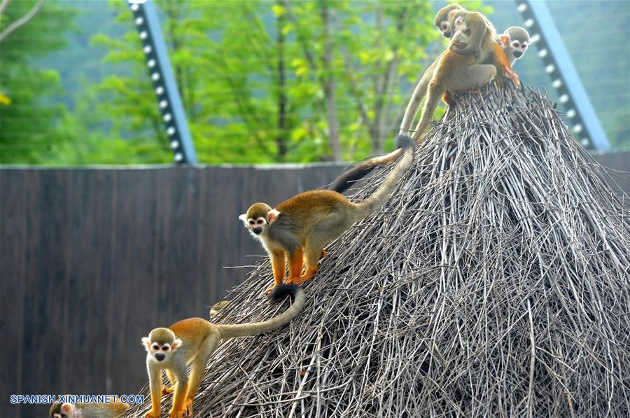JIANGSU, agosto 13, 2018 (Xinhua) -- Monos ardilla se divierten en el Zoológico Forestal Shangfangshan, en Suzhou, provincia de Jiangsu, en el este de China, el 13 de agosto de 2018. (Xinhua/Hang Xingwei)
