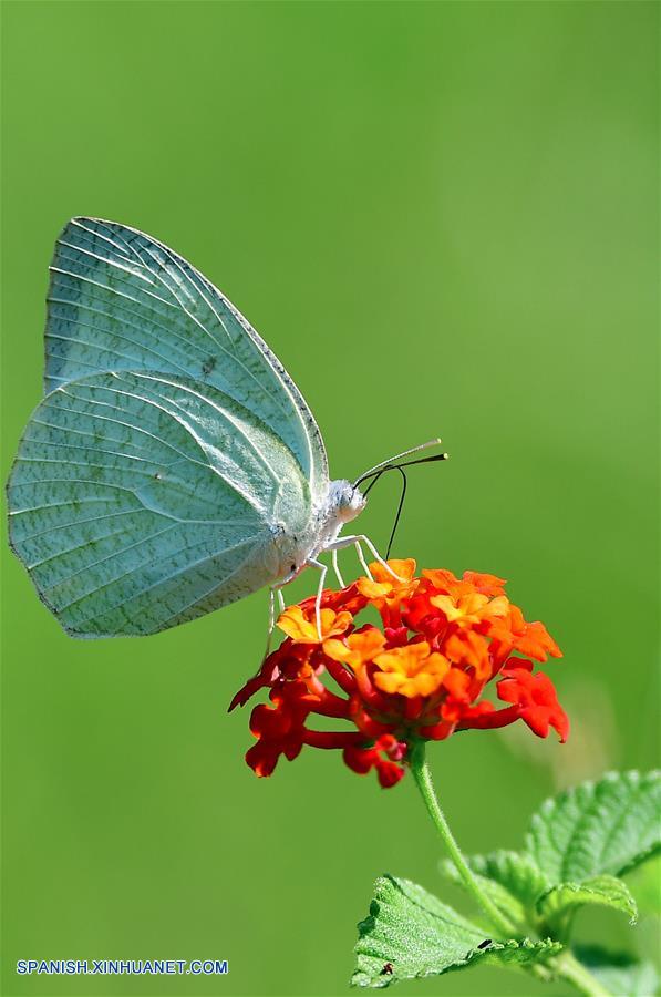 FUJIAN, agosto 13, 2018 (Xinhua) -- Imagen del 12 de agosto de 2018 de una mariposa parada en una flor lantana camara, en el Parque Wenquan en Fuzhou, capital de la provincia de Fujian, en el sureste de China. (Xinhua/Mei Yongcun)