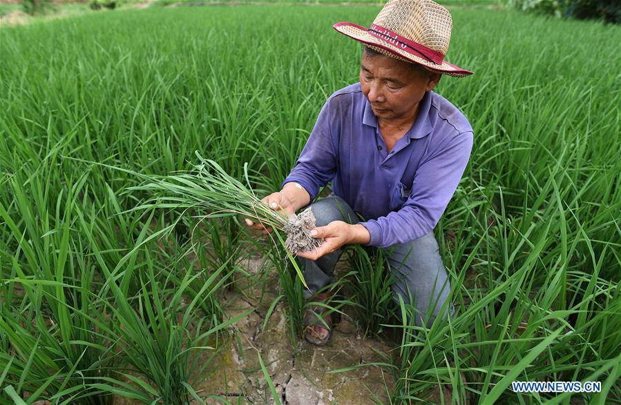 Un agricultor comprueba los brotes de arroz en la aldea Yinshan del municipio Liuli, en Jinxi, provincia de Jiangxi. Algunas zonas de la provincia de Jiangxi han sufrido una prolongada sequía debido al persistente calor del verano y a la ausencia de precipitaciones. 14 de agosto del 2018. (Foto: Xinhua/ Wan Xiang)