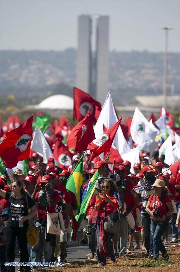 BRASILIA, 14 ago (Xinhua) -- Unos 5.000 manifestantes miembros del Movimiento de Trabajadores Rurales Sin Tierra (MST) llegaron hoy martes al centro de Brasilia en apoyo a Luiz Inácio Lula da Silva, cuya candidatura presidencial será registrada ma?ana miércoles en el Tribunal Superior Electoral (TSE).
