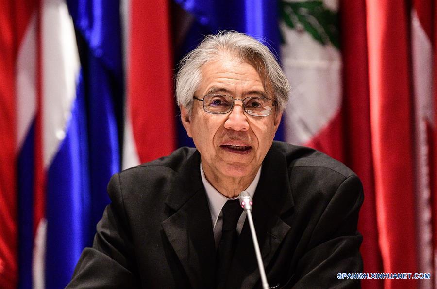SANTIAGO, agosto 14, 2018 (Xinhua) -- El director de la División de Desarrollo Sostenible y Asentamientos de la Comisión Económica para América Latina y el caribe (CEPAL), Joséluis Samaniego, participa durante la inauguración del seminario-taller: "Papel de las Defensorías del Pueblo en la promoción de una minería respetuosa con los derechos humanos y el medio ambiente", en la sede de la CEPAL, en Santiago, capital de Chile, el 14 de agosto de 2018. Expertos se congregaron hoy en la sede de la Comisión Económica para América Latina y el Caribe (CEPAL) en Chile para advertir sobre la "finitud" de los recursos naturales no renovables y realizar un llamado a unificar "las buenas prácticas" en la región, en el marco de una "minería respetuosa". (Xinhua/Jorge Villegas)