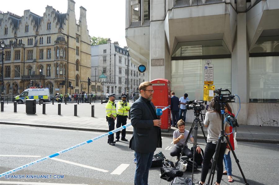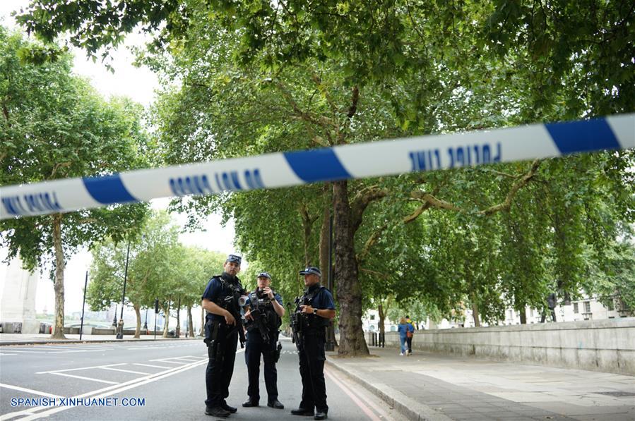 LONDRES, agosto 14, 2018 (Xinhua) -- La Policía Metropolitana de Londres acordona el área cerca del Parlamento Británico, en Londres, Reino Unido, el 14 de agosto de 2018. Un hombre fue arrestado por presuntos delitos de terrorismo después de que chocara un automóvil contra las barreras de seguridad del Parlamento Británico, informó el martes la policía local. (Xinhua/Wang Heming)