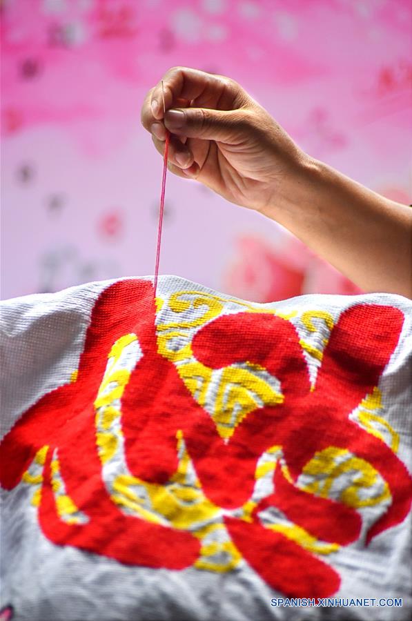 Una mujer elabora una pieza de bordado en el condado de Yiyuan de la ciudad de Zibo, en la provincia de Shandong, en el este de China, el 14 de agosto de 2018. En a?os recientes, el gobierno de Yiyuan ha realizado esfuerzos en el desarrollo de la industria del bordado y el tejido. A través del establecimiento de cooperativas y asociaciones de la industria, el gobierno ayuda a abrir el mercado doméstico e internacional para los productos y elevar el ingreso para los locales. (Xinhua/Zhao Dongshan)