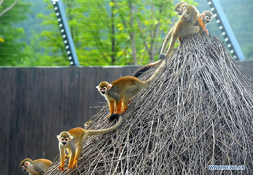 Suzhou, Jiangsu, 15/08/2018 (Pueblo en Línea) – Monos ardilla disfruta al aire libre en el Zoológico del Bosque Shangfangshan en Suzhou, provincia de Jiangsu, 13 de agosto del 2018. (Foto: Xinhua/ Hang Xingwei)