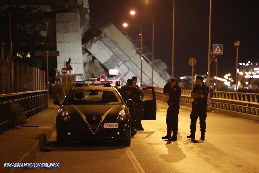 GENOVA, agosto 15, 2018 (Xinhua) -- Policías vigilan cerca del sitio donde un puente colapsó, en Génova, en el noroeste de Italia, el 15 de agosto de 2018. (Xinhua/Zheng Huansong)