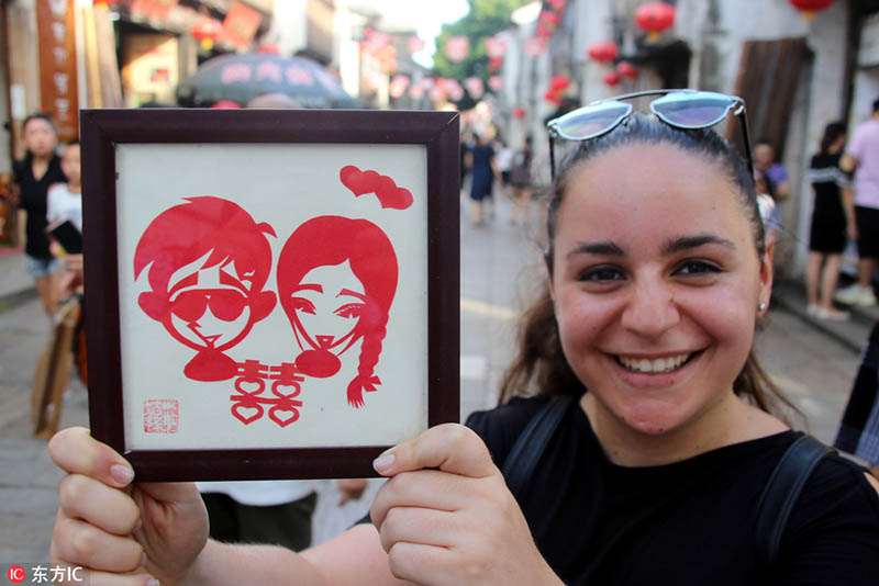 Un turista muestra un recorte de papel hecho por un artista popular chino para el próximo Festival Qixi, o Día de San Valentín chino, en la ciudad de Suzhou, provincia de Jiangsu, este de China, el 14 de agosto de 2018. [Foto / IC]