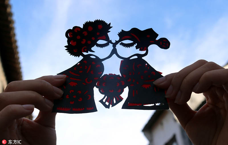 Un turista muestra un corte de papel hecho por un artista popular chino para el próximo Festival Qixi, o Día de San Valentín chino, en la ciudad de Suzhou, provincia de Jiangsu, este de China, el 14 de agosto de 2018. [Foto / IC]