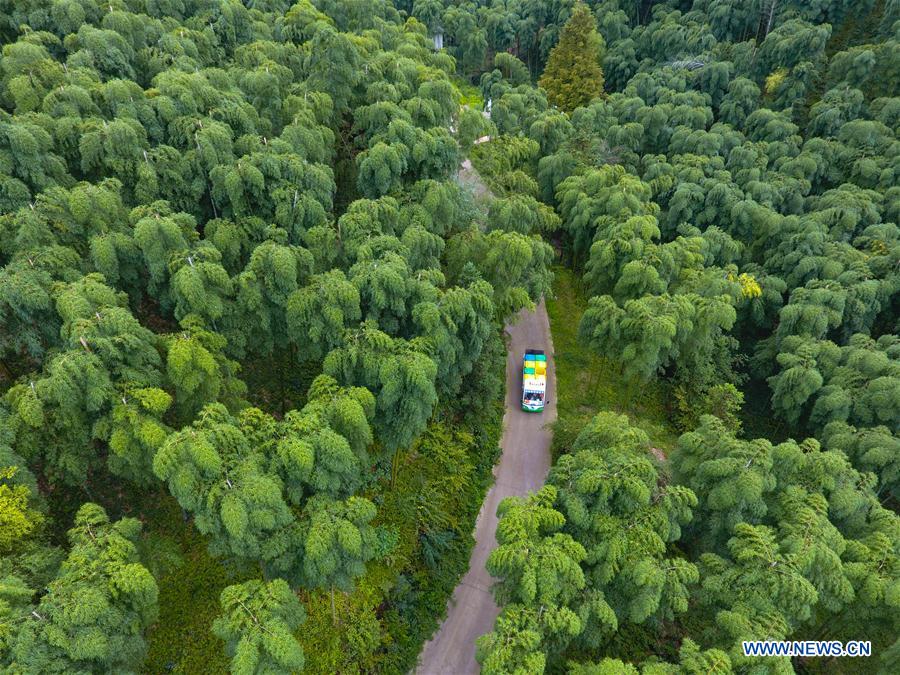 Servicios de saneamiento avanzan hacia Wuhe, aldea ubicada en el municipio Anji, Zhejiang. Esta provincia capacita y estimula a los residentes para que clasifiquen la basura como una forma útil de conservar los hermosos paisajes rurales. 16 de agosto del 2018. (Foto: Xinhua/Zhang Chen)