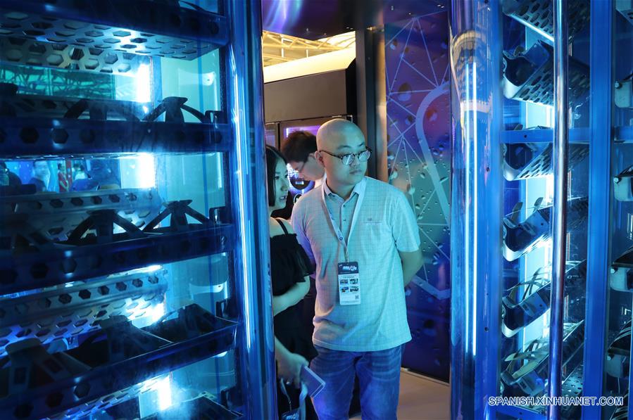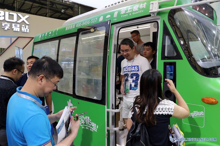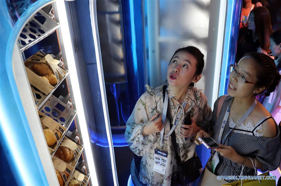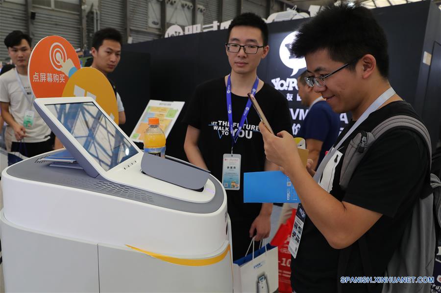 SHANGHAI, agosto 15, 2018 (Xinhua) -- Visitantes observa una máquina expendedora sin vigilancia durante la Exposición Internacional Minorista Sin Vigilancia de Shanghai 2018, en Shanghai, en el este de China, el 15 de agosto de 2018. La exposición comenzó el miércoles, exhibiendo modos de venta minorista sin vigilancia, incluida la máquina expendedora, la tienda de conveniencia, el restaurante, la estación de servicio, la lavandería y otros servicios de diversión y ocio. (Xinhua/Fang Zhe)