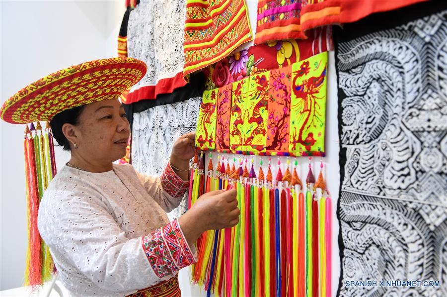 HOHHOT, agosto 15, 2018 (Xinhua) -- La heredera del patrimonio cultural intangible, Feng Xuemei, muestra las artesanías Huayao de a través del Estrecho del grupo étnico Yao durante una exposición llevada a cabo en Hohhot, en la Región Autónoma de Mongolia Interior, en el norte de China, el 15 de agosto de 2018. (Xinhua/Liu Lei)