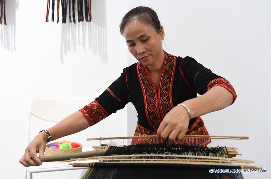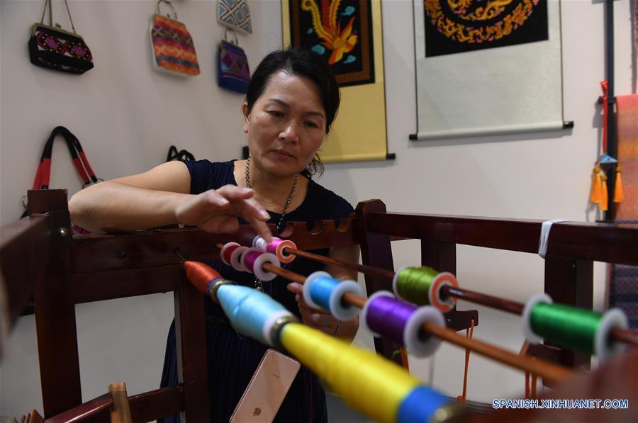 La heredera del patrimonio cultural intangible, Li Cunling, muestra la técnica de brocado del grupo étnico Zhuang durante una exposición llevada a cabo en Hohhot, en la Región Autónoma de Mongolia Interior, en el norte de China, el 15 de agosto de 2018. (Xinhua/Liu Lei)