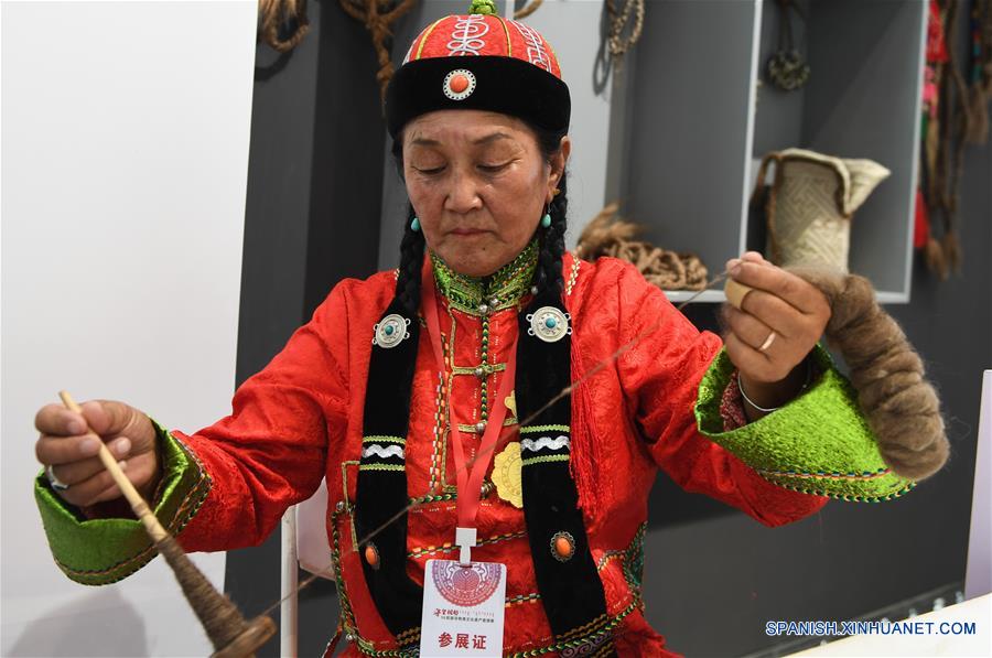Una heredera del patrimonio cultural intangible muestra las habilidades de hilado del grupo étnico Mongol durante una exposición llevada a cabo en Hohhot, en la Región Autónoma de Mongolia Interior, en el norte de China, el 15 de agosto de 2018. (Xinhua/Liu Lei)