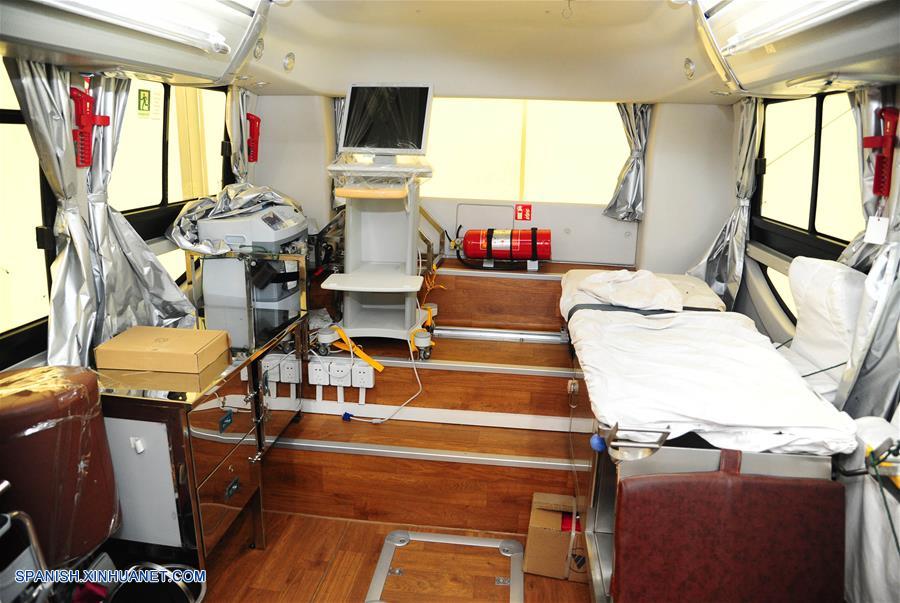 DAMASCO, agosto 16, 2018 (Xinhua) -- Vista del interior de una clínica médica móvil en una ceremonia de donación, en Damasco, Siria, el 16 de agosto de 2018. La Sociedad de la Cruz Roja de China (RCSC) donó el jueves clínicas médicas móviles y ambulancias a la Media Luna Roja Arabe de Siria. El donativo, que incluye dos autobuses convertidos en clínicas médicas móviles y dos ambulancias, fue entregado en una ceremonia realizada en la capital siria de Damasco. (Xinhua/Ammar Safarjalani)