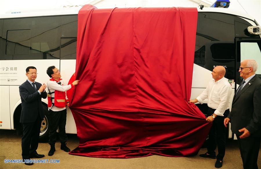 DAMASCO, agosto 16, 2018 (Xinhua) -- Oficiales de la Sociedad de la Cruz Roja de China (RCSC) y de la Media Luna Roja Arabe de Siria, inauguran una clínica médica móvil en una ceremonia de donación, en Damasco, Siria, el 16 de agosto de 2018. La Sociedad de la Cruz Roja de China (RCSC) donó el jueves clínicas médicas móviles y ambulancias a la Media Luna Roja Arabe de Siria. El donativo, que incluye dos autobuses convertidos en clínicas médicas móviles y dos ambulancias, fue entregado en una ceremonia realizada en la capital siria de Damasco. (Xinhua/Ammar Safarjalani)