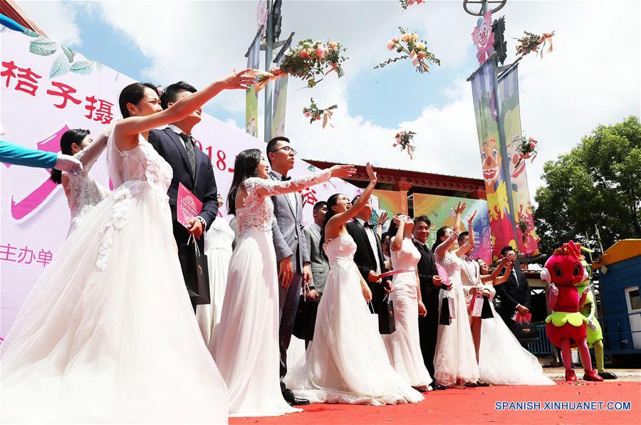 Parejas de recién casados asisten a una ceremonia de boda masiva en el parque de diversiones Happy Valley, en Shanghai, en el este de China, el 18 de agosto de 2018. (Xinhua/Fang Zhe)