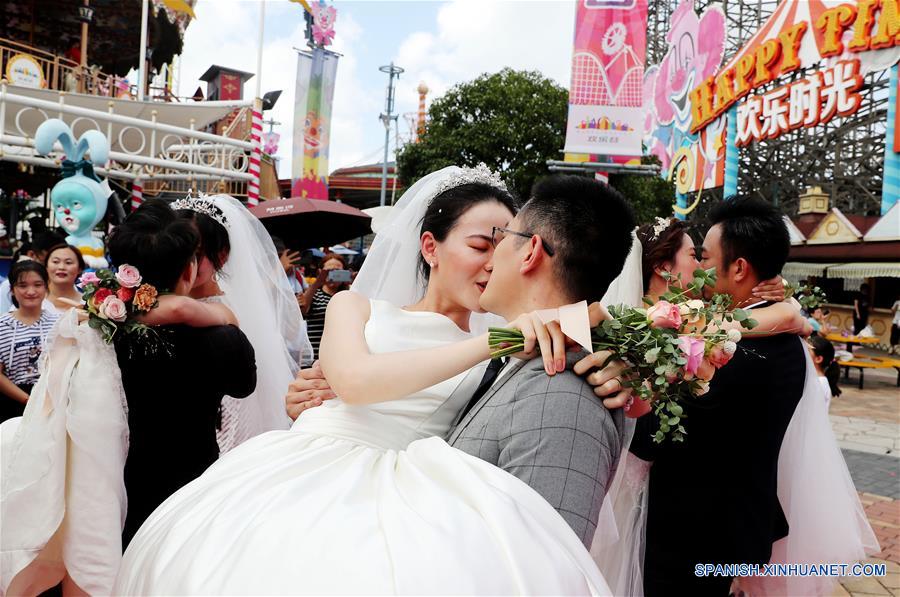 SHANGHAI, agosto 18, 2018 (Xinhua) -- Parejas de recién casados asisten a una ceremonia de boda masiva en el parque de diversiones Happy Valley, en Shanghai, en el este de China, el 18 de agosto de 2018. (Xinhua/Fang Zhe)