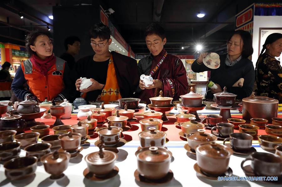 Imagen del 17 de agosto de 2018 de visitantes observando cerámica tibetana en un mercado sobre patrimonios culturales intangibles, en el condado de Rangtang, provincia de Sichuan, en el suroeste de China. El mercado llamado Rangbala abrió al público el viernes en Rangtang, y exhibe y vende productos de 26 tipos de los patrimonios culturales intangibles locales. (Xinhua/Jiang Hongjing)