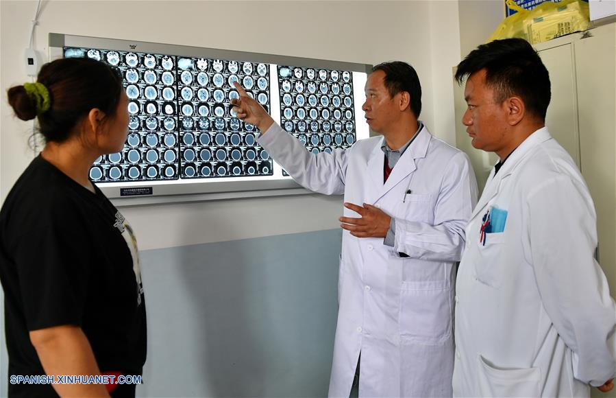 NYINGCHI, agosto 17, 2018 (Xinhua) -- Imagen del 16 de agosto de 2018 del doctor Li Weiguang (2-d) del Hospital de Nanfang de Guangdong y doctor local dando una explicación del progreso del tratamiento médico a una mujer en el Hospital Popular, en Nyingchi, en la región autónoma del Tíbet, en el suroeste de China. La provincia de Guangdong ha enviado cuatro grupos de personal médico al Hospital Popular de Nyingchi en los últimos cuatro a?os para proporcionar mejores servicios de atención médica a los residentes. (Xinhua/Zhang Rufeng)