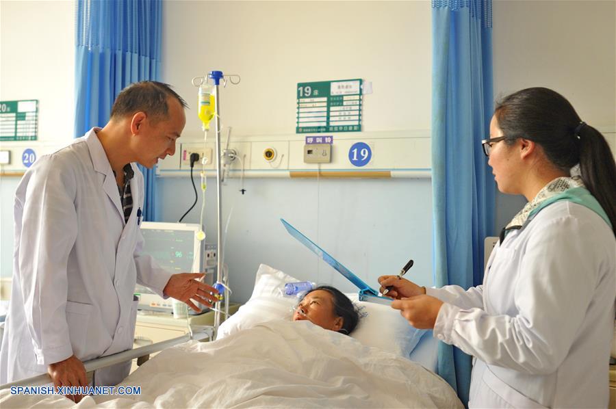 NYINGCHI, agosto 17, 2018 (Xinhua) -- Imagen del 16 de agosto de 2018 del doctor Deng Wujian (i) del segundo Hospital Afiliado de la Universidad Médica de Guangzhou y doctor local realizando rondas por las salas del Hospital Popular, en Nyingchi, en la región autónoma del Tíbet, en el suroeste de China. La provincia de Guangdong ha enviado cuatro grupos de personal médico al Hospital Popular de Nyingchi en los últimos cuatro a?os para proporcionar mejores servicios de atención médica a los residentes. (Xinhua/Zhang Rufeng)