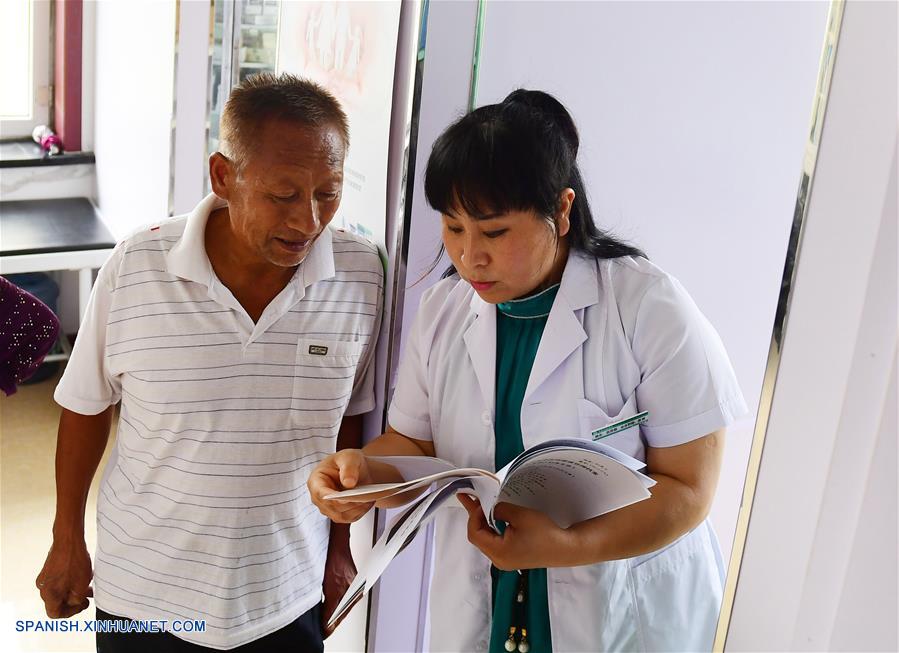 JILIN, agosto 17, 2018 (Xinhua) -- Imagen del 9 de agosto de 2018 de Yue Yanwei (d) revisando el expediente de un aldeano, en la villa de Qixin en la localidad de Gangyao de la ciudad de Jilin, provincia de Jilin, en el noreste de China. Yue, de 40 a?os de edad, ha sido doctora en la villa de Qixin durante 17 a?os desde su graduación de la escuela de medicida en 2001. Yue es el único médico en Qixin, donde viven unos 1,070 aldeanos. En opinion de Yue, la salud de todos importa, por lo que optó por permanecer en su puesto y se hizo cargo de los aldeanos. (Xinhua/Lin Hong)