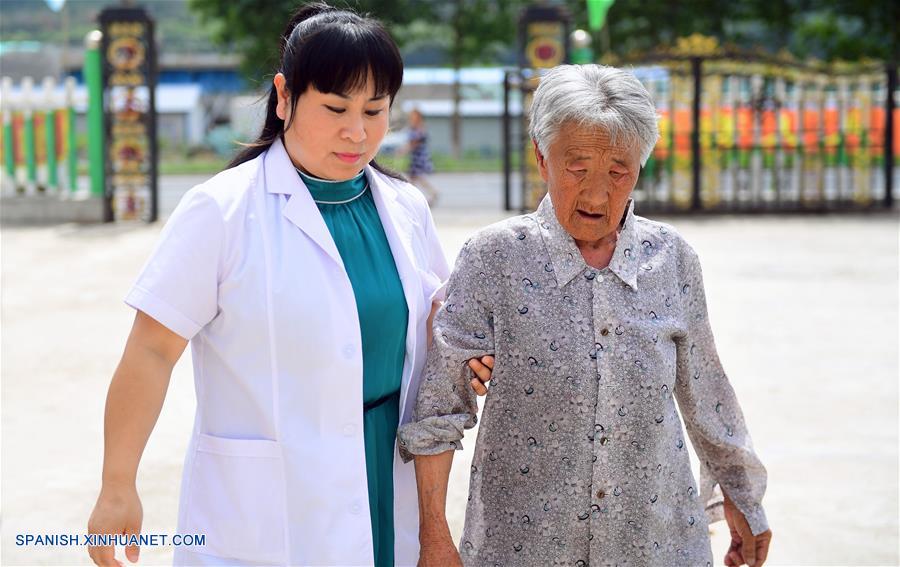 JILIN, agosto 17, 2018 (Xinhua) -- Imagen del 9 de agosto de 2018 de Yue Yanwei (i) caminando con la aldeana Song Shulan, de 81 a?os de edad, en la villa de Qixin en la localidad de Gangyao de la ciudad de Jilin, provincia de Jilin, en el noreste de China. Yue, de 40 a?os de edad, ha sido doctora en la villa de Qixin durante 17 a?os desde su graduación de la escuela de medicida en 2001. Yue es el único médico en Qixin, donde viven unos 1,070 aldeanos. En opinion de Yue, la salud de todos importa, por lo que optó por permanecer en su puesto y se hizo cargo de los aldeanos. (Xinhua/Lin Hong)