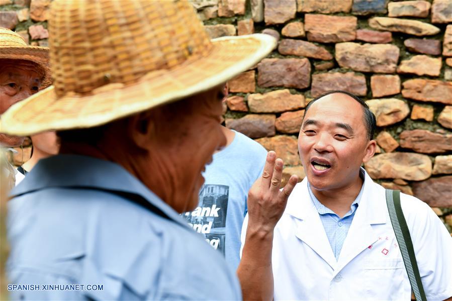 SHANDONG, agosto 17, 2018 (Xinhua) -- Imagen del 16 de agosto de 2018 de Zhang Deqing introduciendo los conocimiento de salud a los residentes, en la villa de Liyanjian en la localidad de Yuandongtou del condado de Yishui, provincia de Shandong, en el este de China. Zhang ha sido médico de la villa de Yuandongtou de la localidad de Yuandongtou en Shandong durante 20 a?os. Su trabajo abarca a casi 2,000 aldeanos en tres villas de la localidad de Yuandongtou. Como muchos hogares están dispersos por las villas, Zhang tiene que escalar caminos monta?osos para visitar a los pacientes. Ahora hay cuatro generaciones de médicos en la familia de Zhang, incluidos el abuelo de Zhang, Zhang Daoli y el padre Zhang Zaiji. Los dos hijos de Zhang se graduaron de facultades de medicina en 2017, para convertirse en el cuarto Dr. Zhang en la ciudad. (Xinhua/Guo Xulei)