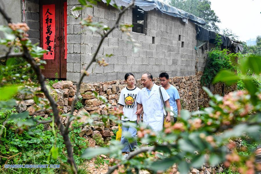 SHANDONG, agosto 17, 2018 (Xinhua) -- Imagen del 16 de agosto de 2018 de Zhang Deqing (c) visitando a un paciente con sus hijos, en la villa de Liyanjian en la localidad de Yuandongtou del condado de Yishui, provincia de Shandong, en el este de China. Zhang ha sido médico de la villa de Yuandongtou de la localidad de Yuandongtou en Shandong durante 20 a?os. Su trabajo abarca a casi 2,000 aldeanos en tres villas de la localidad de Yuandongtou. Como muchos hogares están dispersos por las villas, Zhang tiene que escalar caminos monta?osos para visitar a los pacientes. Ahora hay cuatro generaciones de médicos en la familia de Zhang, incluidos el abuelo de Zhang, Zhang Daoli y el padre Zhang Zaiji. Los dos hijos de Zhang se graduaron de facultades de medicina en 2017, para convertirse en el cuarto Dr. Zhang en la ciudad. (Xinhua/Guo Xulei)