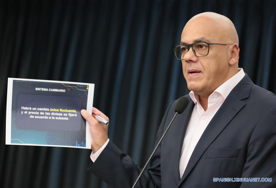 Imagen cedida por la Presidencia de Venezuela, del ministro venezolano de Comunicación, Jorge Rodríguez, participando durante una conferencia de prensa, en el Palacio de Miraflores, en Caracas, Venezuela, el 18 de agosto de 2018. El ministro venezolano de Comunicación, Jorge Rodríguez, anunció el sábado la apertura de 300 franquicias de casas de cambio en hoteles, aeropuertos y centros comerciales del país. (Xinhua/Presidencia de Venezuela)