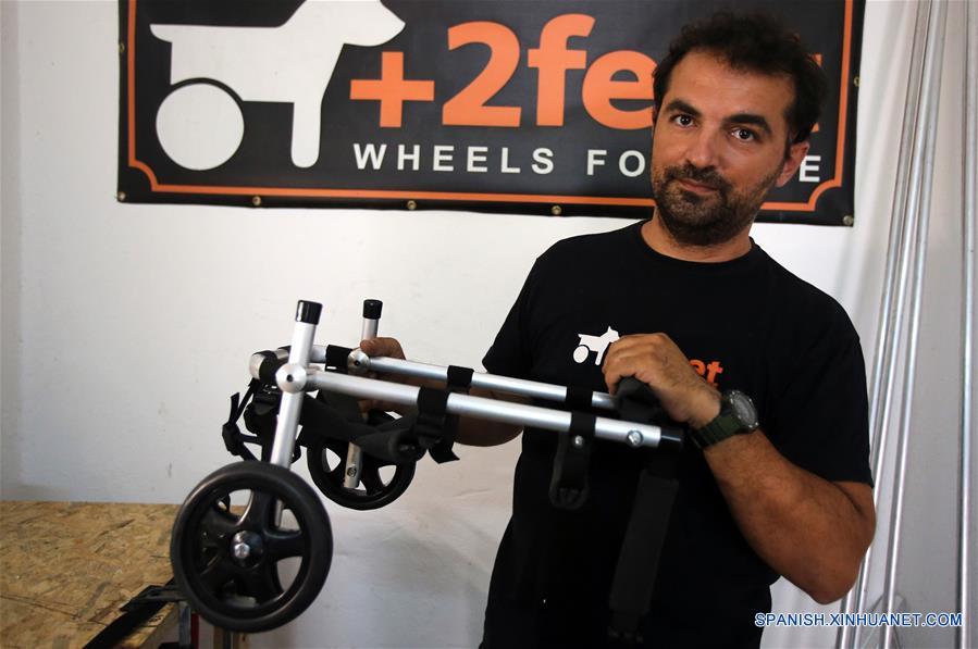 Imagen del 17 de agosto de 2018 de Vassilis Tzigouras mostrando una silla de ruedas para mascotas en su taller en Atenas, Grecia. (Xinhua/Marios Lolos)