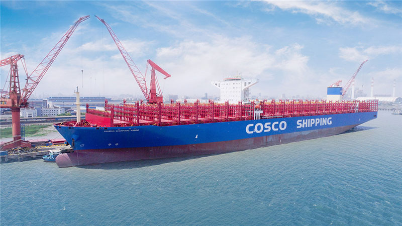 El gran portacontenedores Cosco Shipping Virgo, que tiene una superficie de cubierta de hasta cuatro campos de fútbol, fue entregado por Shanghai Waigaoqiao Shipbuilding Co en un puerto el 29 de mayo de 2018. [Foto proporcionada a chinadaily.com.cn]