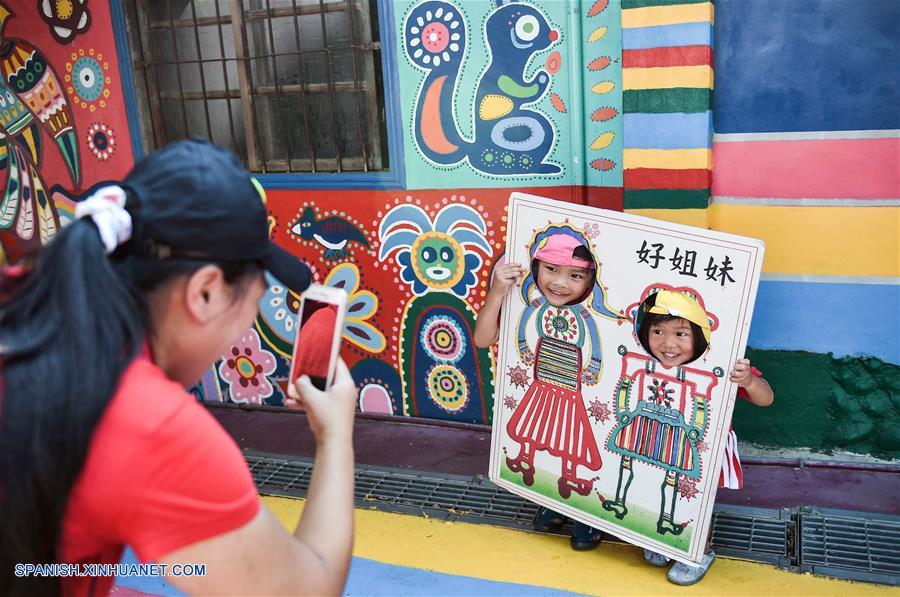 TAICHUNG, agosto 20, 2018 (Xinhua) -- Ni?os posan en una comunidad residencial llamada "aldea arcoiris" en el distrito Nantun de la ciudad de Taichung, en Taiwán, en el sureste de China, el 20 de agosto de 2018. Las coloridas pinturas en las paredes y pisos de la aldea atraen a muchos turistas. (Xinhua/Xue Yubin)