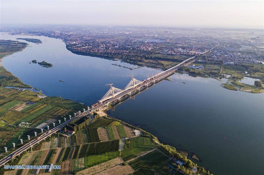 HUBEI, agosto 20, 2018 (Xinhua) -- Vista aérea del sitio de construcción del Puente Hanjiang de la Vía Férrea Menghua a través del Río Hanjiang, en la ciudad de Xiangyang, provincia de Hubei, en el centro de China, el 20 de agosto de 2018. El Puente Hanjiang de la Vía Férrea Menghua terminó el lunes su instalación de cables. El puente, de 5,242 metros de largo, es una parte importante de la Vía Férrea Menghua, una ruta estratégica de 1,817 kilómetros para el transporte de carbón que une la Región Autónoma de Mongolia Interior, rica en carbón y ubicada en el norte de China, con el centro y el sur de China. (Xinhua/Jin Wei)
