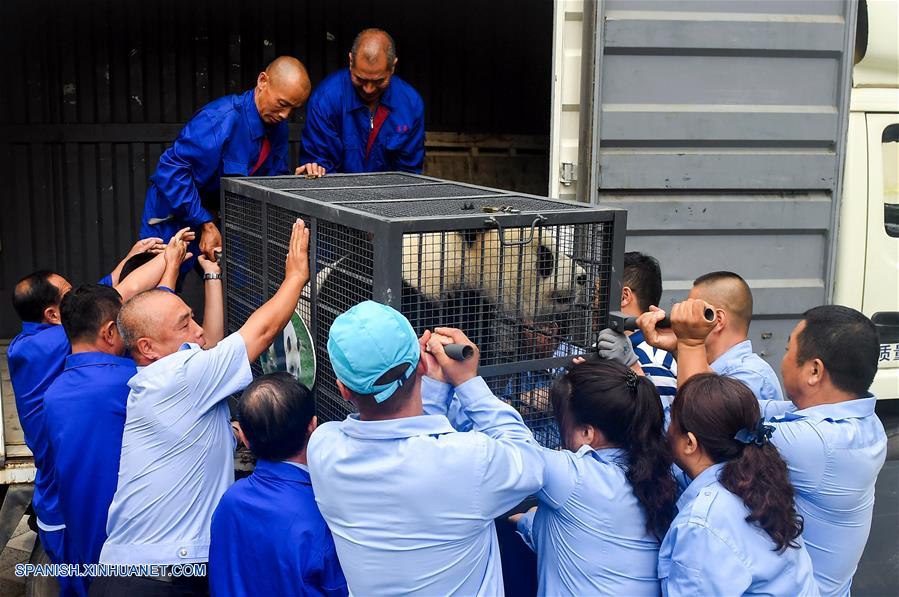 CHANGCHUN, agosto 20, 2018 (Xinhua) -- Trabajadores suben a un panda gigante a un camión antes de dirigirse al aeropuerto en Changchun, capital de la provincia de Jilin, en el noreste de China, el 20 de agosto de 2018. Los pandas gigantes Jiajia y Mengmeng comenzaron el lunes su viaje de regreso a la base Dujiangyan del Centro de Investigación y Conservación del Panda Gigante de China, en Sichuan, para el programa de cría 2019. Hace tres a?os, fueron trasladados de Sichuan y les otorgaron nuevos hogares en el Centro de Rescate y Crianza de la Vida Salvaje de Jilin, convirtiéndose en los primeros pandas gigantes en vivir en un hábitat de gran altitud. (Xinhua/Xu Chang)