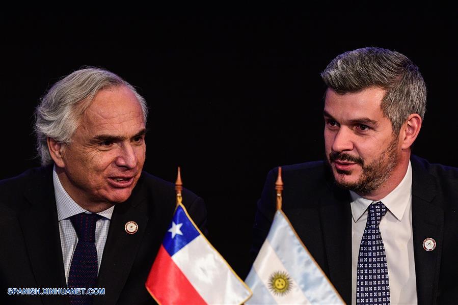 SANTIAGO, agosto 22, 2018 (Xinhua) -- El ministro del Interior y Seguridad Pública chileno, Andrés Chadwick (i), y el jefe de Gabinete de Ministros de Argentina, Marcos Pe?a (d), participan durante la ceremonia de firma de acuerdos en el marco de la IX Reunión Binacional de Ministros de Chile y Argentina, en Santiago, capital de Chile, el 22 de agosto de 2018. Chile y Argentina firmaron el miércoles una batería de acuerdos en materia de infraestructura, facilitación fronteriza, conectividad e integración económica, entre otros asuntos, con el propósito de reforzar la relación entre las naciones vecinas, en el marco de la IX Reunión Binacional de Ministros de Chile y Argentina. (Xinhua/Jorge Villegas)