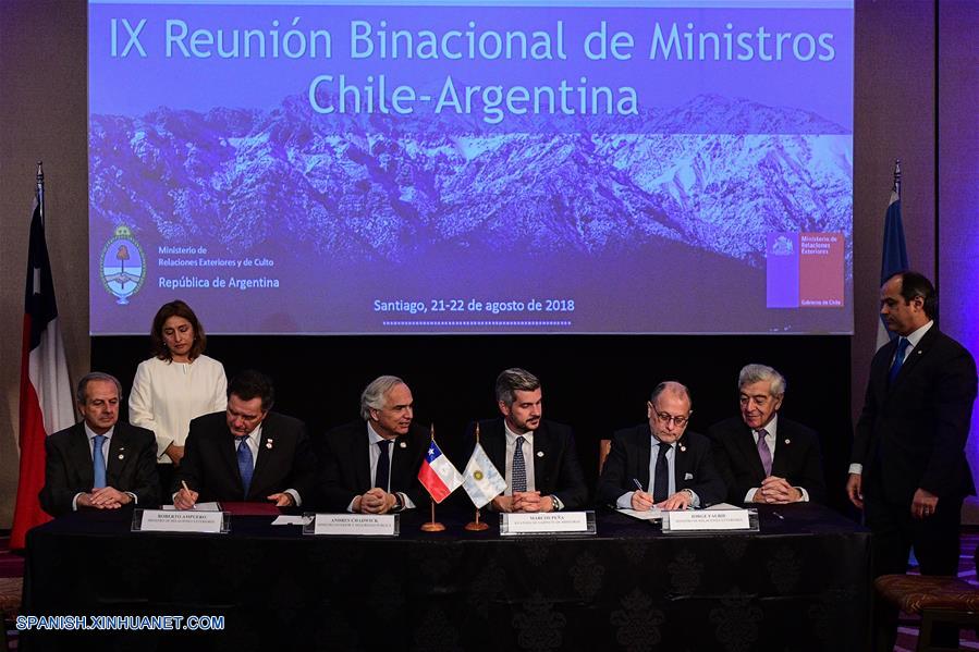 SANTIAGO, agosto 22, 2018 (Xinhua) -- El ministro de Relaciones Exteriores chileno, Roberto Ampuero (2-i-frente), el ministro del Interior y Seguridad Pública chileno, Andrés Chadwick (3-i), el jefe de Gabinete de Ministros de Argentina, Marcos Pe?a (c), y el ministro de Relaciones Exteriores argentino, Jorge Faurie (3-d), participan durante la ceremonia de firma de acuerdos en el marco de la IX Reunión Binacional de Ministros de Chile y Argentina, en Santiago, capital de Chile, el 22 de agosto de 2018. Chile y Argentina firmaron el miércoles una batería de acuerdos en materia de infraestructura, facilitación fronteriza, conectividad e integración económica, entre otros asuntos, con el propósito de reforzar la relación entre las naciones vecinas, en el marco de la IX Reunión Binacional de Ministros de Chile y Argentina. (Xinhua/Jorge Villegas)