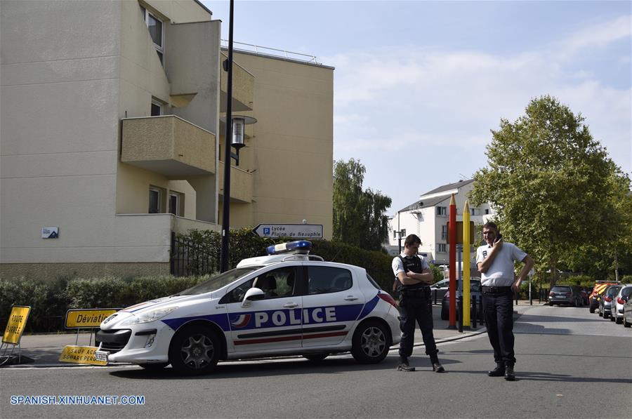 PARIS, agosto 23, 2018 (Xinhua) -- Policías montan guardia cerca de la escena donde se registró un ataque, en los suburbios de París, Francia, el 23 de agosto de 2018. Dos personas murieron y otra resultó herida el jueves tras ser apu?aladas por un hombre que fue abatido por la policía en Trappes, en el oeste de París, según los medios locales. (Xinhua/Chen Yichen)