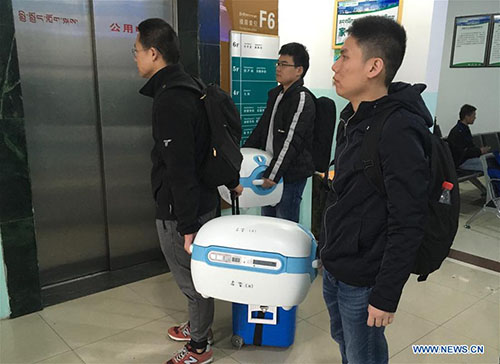 Los miembros del personal de la unidad de transporte de órganos donados llegan al aeropuerto de Lhasa, Región Autónoma del Tíbet, el 22 de agosto del 2018. Esta es la primera cirugía de adquisición de órganos en el Tíbet y se llevó a cabo con éxito. Los órganos obtenidos serán trasplantados a receptores en Anhui y Yunnan. (Foto: Xinhua/ Wang Qinou)