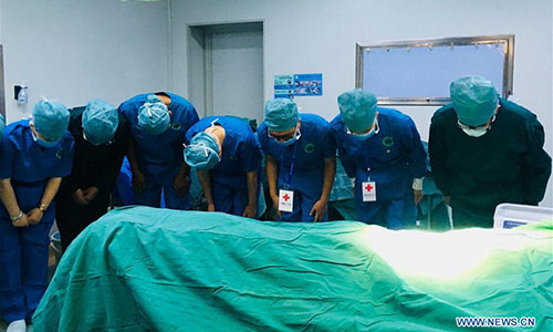 Tíbet, 24/08/2018 (El Pueblo en Línea) - El personal médico presenta sus respetos al fallecido donante de órganos después de terminar la cirugía para la adquisición de órganos en el hospital del pueblo Shannan, Región Autónoma del Tíbet, el 22 de agosto del 2018. Esta es la primera cirugía de adquisición de órganos en el Tíbet y se llevó a cabo con éxito. Los órganos obtenidos serán trasplantados a receptores en Anhui y Yunnan. (Foto: Xinhua/ Wang Qinou)