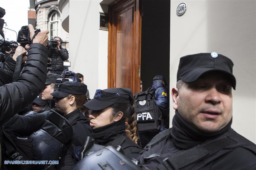 BUENOS AIRES, agosto 23, 2018 (Xinhua) -- Efectivos de la Policía Federal ingresan al departamento de la ex presidenta y actual senadora argentina, Cristina Fernández, en Buenos Aires, capital de Argentina, el 23 de agosto de 2018. Efectivos de la Policía Federal de Argentina realizaban el jueves allanamientos en tres domicilios de la ex presidenta argentina Cristina Fernández (2007-2015) por una orden judicial en el marco de una investigación por el presunto pago de sobornos de parte de empresarios a ex funcionarios. (Xinhua/Martín Zabala)