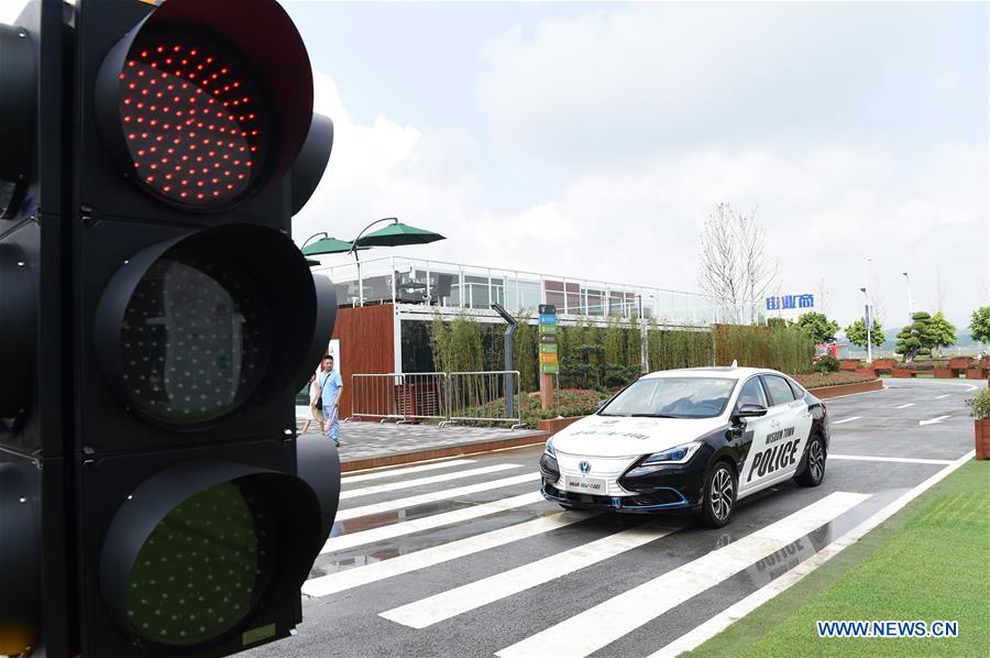 Un coche autoconducido avanza respetando los semáforos dentro de la ciudad inteligente de la primera edición de la Exposición China Inteligente inaugurada en Chongqing. La ciudad inteligente, una zona especial de exhibición que ocupa 30.000 metros cuadrados, abrió al público este jueves para mostrar la vida cotidiana asistida por la tecnología de punta. La muestra estará abierta durante todo un a?o. 23 de agosto del 2018. (Foto: Xinhua/ Tang Yi)