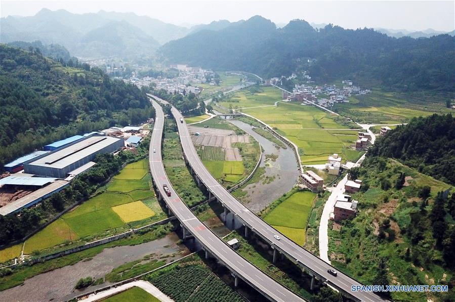 Vista aérea del paisaje a lo largo de la Autopista Lanzhou-Haikou, en el municipio de Mochong de la ciudad de Duyun, provincia de Guizhou, en el suroeste de China, el 25 de agosto de 2018. (Xinhua/Yang Wenbin)