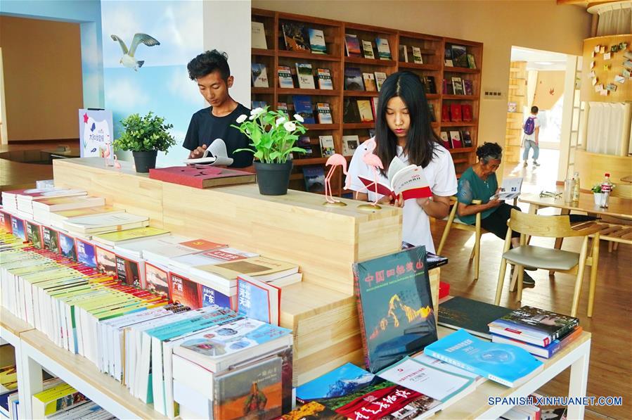 Turistas leen en un bar de libros, en un punto escénico en Beidaihe, provincia de Hebei, en el norte de China, el 25 de agosto de 2018. Los bares de libros fueron establecidos en muchos puntos escénicos en Beidaihe para los turistas. (Xinhua/Yang Shiyao)