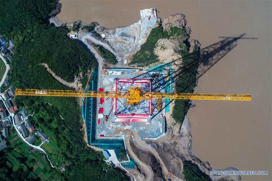 Vista de una torre gigante de suministro de energía en construcción en la isla Cezi de Zhoushan, provincia de Zhejiang, en el este de China, el 28 de agosto de 2018. A una impresionante altura de 380 metros, las dos torres llevarán los cables de alimentación entre las islas Jintang y Cezi de Zhoushan, recorriendo una distancia de 2,656 metros. El nuevo proyecto de las torres es una parte de un nuevo proyecto de línea de energía de ultra alta tensión entre las ciudades de Zhoushan y Ningbo, que está programado que sea terminado para finales de octubre. (Xinhua/Xu Yu)