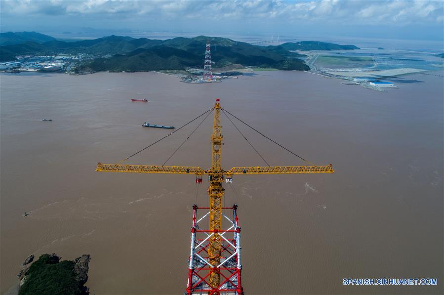 Vista de una torre gigante de suministro de energía en construcción en la isla Cezi de Zhoushan, provincia de Zhejiang, en el este de China, el 28 de agosto de 2018. A una impresionante altura de 380 metros, las dos torres llevarán los cables de alimentación entre las islas Jintang y Cezi de Zhoushan, recorriendo una distancia de 2,656 metros. El nuevo proyecto de las torres es una parte de un nuevo proyecto de línea de energía de ultra alta tensión entre las ciudades de Zhoushan y Ningbo, que está programado que sea terminado para finales de octubre. (Xinhua/Xu Yu)