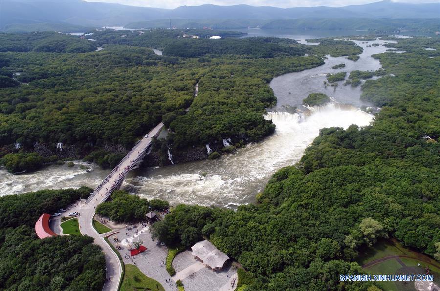 HEILONGJIANG, agosto 28, 2018 (Xinhua) -- Vista aérea de la Cascada Diaoshuilou en el área escénica del lago Jingpo, en Mudanjiang, provincia de Heilongjiang, en el noreste de China, el 28 de agosto de 2018. El espléndido paisaje de la Cascada Diaoshuilou atrae a muchos turistas. (Xinhua/Zhang Chunxiang)
