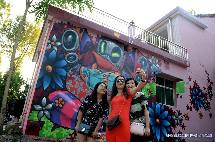 Imagen del 28 de agosto de 2018 de visitantes posando para una "selfie" frente a un graffiti en el área escénica de Rose Town del condado de Luonan, provincia de Shaanxi, en el noroeste de China. Cuarenta y cuatro artistas del país y el extranjero participaron en el 2 concurso internacional del graffiti de Shangluo (Luonan) de China comenzando el martes en Rose Town, el cual fue implementado por el condado de Luonan especialmente para el desarrollo cultural y el turismo. (Xinhua/Liu Xiao)