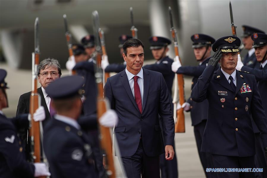 El presidente del Gobierno espa?ol, Pedro Sánchez (c) llega al aeropuerto militar de Catam, en la ciudad de Bogotá, Colombia, el 29 de agosto de 2018. De acuerdo con información de la prensa local, el presidente del Gobierno espa?ol Pedro Sánchez, llegó a Colombia como parte de su gira latinoamericana, donde se reunirá con el presidente colombiano Iván Duque. (Xinhua/Jhon Paz)