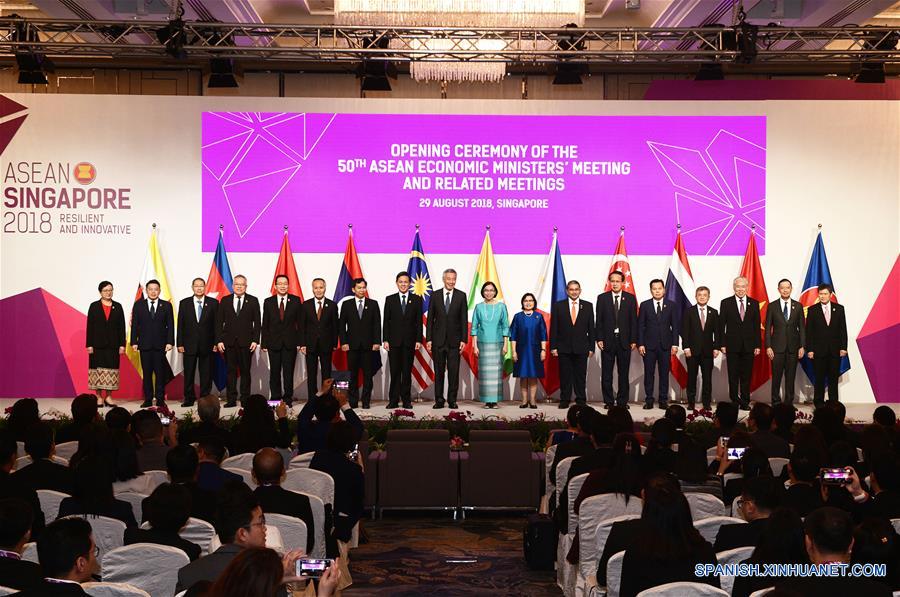 Delegados posan para una fotografía grupal durante la ceremonia de inauguración de la 50 Reunión de Ministros de Economía de la Asociación de Naciones del Sudeste Asiático (ASEAN, por las siglas en inglés) y reuniones relacionadas llevada a cabo en la ciudad de Singapur, capital de Singapur, el 29 de agosto de 2018. La Reunión de Ministros de Economía de la ASEAN y reuniones relacionadas comenzó el miércoles en Singapur, con el primer ministro de Singapur, Lee Hsien Loong, llamando a los estados miembros a continuar fortaleciendo la cooperación e integración económica regional. (Xinhua/Then Chih Wey)