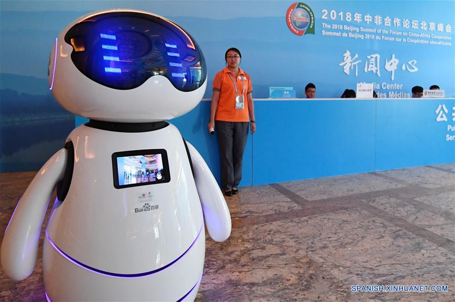 Un robot de consulta es captado en el Centro de Medios de la Cumbre de Beijing 2018 del Foro de Cooperación China-Africa (FOCAC), en el Centro Internacional de Convenciones Jianguo de Beijing del Hotel Internacional de Beijing, en Beijing, capital de China, el 29 de agosto de 2018. El centro de medios del FOCAC comenzó su prueba de operación el miércoles. El centro de medios del FOCAC comenzó el miércoles su prueba de operación. La cumbre está programada para realizarse del 3 al 4 de septiembre en Beijing. (Xinhua/Zhang Chenlin)
