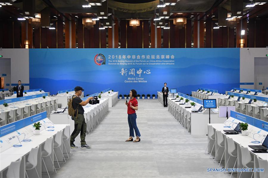 Una periodista reporta en el Area de Trabajo de Medios del Centro de Medios de la Cumbre de Beijing 2018 del Foro de Cooperación China-Africa (FOCAC), en el Centro Internacional de Convenciones Jianguo de Beijing del Hotel Internacional de Beijing, en Beijing, capital de China, el 29 de agosto de 2018. El centro de medios del FOCAC comenzó el miércoles su prueba de operación. La cumbre está programada para realizarse del 3 al 4 de septiembre en Beijing. (Xinhua/Zhang Chenlin)